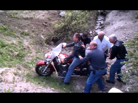 He had wrecked and landed down in a creek, with his bike on top of him. Another passer-by had stopped and got the bike off him. All our men worked together to get the motorcycle out of the ditch. Then Jesse got it started and they helped push him out.